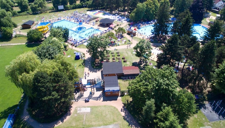 Areál koupaliště se dělí do čtyř částí: vodní svět, dětské hřiště a sportovní hřiště, písečnou pláž se vzduchovými trampolínami a část s občerstvením.